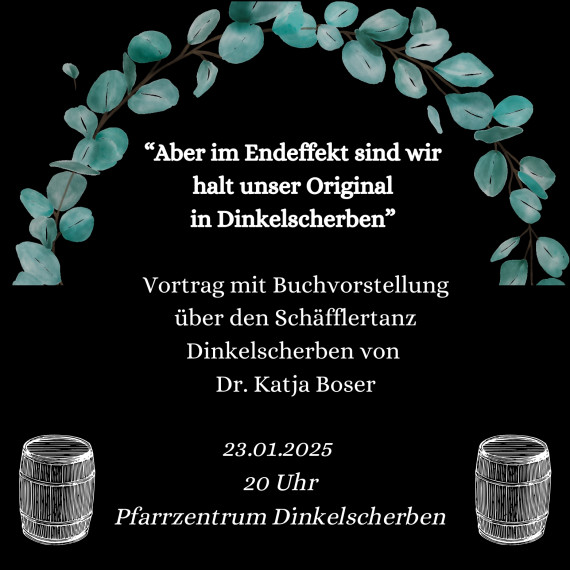 Die Ergebnisse ihrer Forschung präsentiert sie am 23.01.2026 um 20 Uhr im Pfarrzentrum Dinkelscherben. Im Vortrag wird die Abgrenzung des Dinkelscherbener Schäfflertanzes nach Außen stehen – vom Münchner ‚Original‘ bis zum Nachbarort Zusmarshausen.